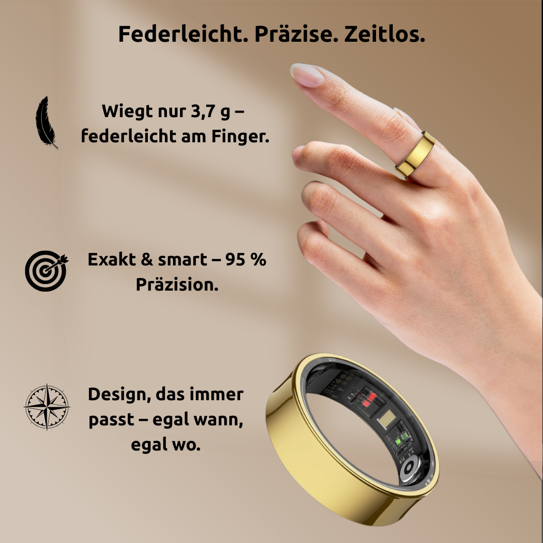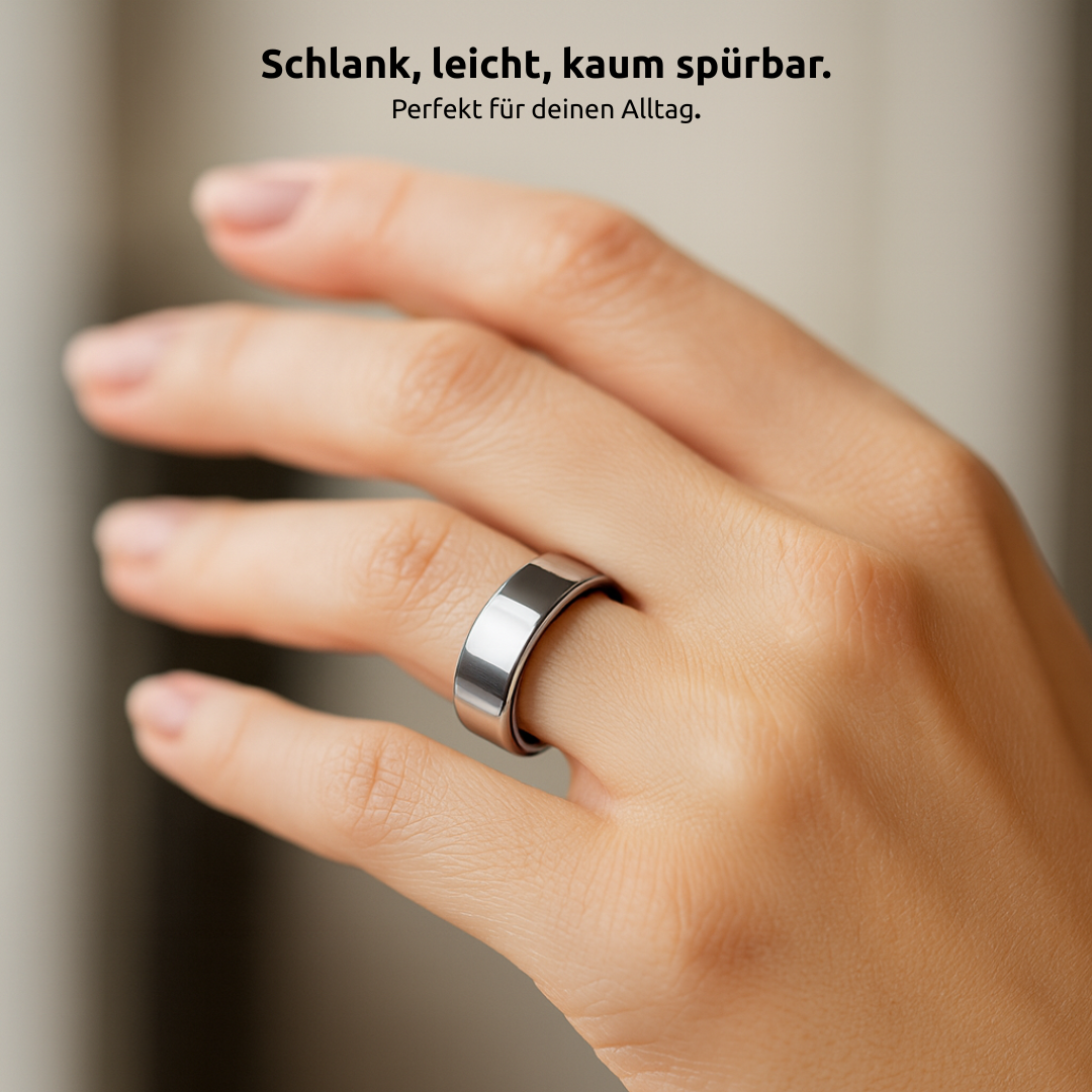 Der Ring wird wie ein normaler Ring am Finger getragen. Dank seines ultraleichten Designs (nur 3,7 g) spürst du ihn kaum – egal ob im Alltag, beim Sport oder im Schlaf.